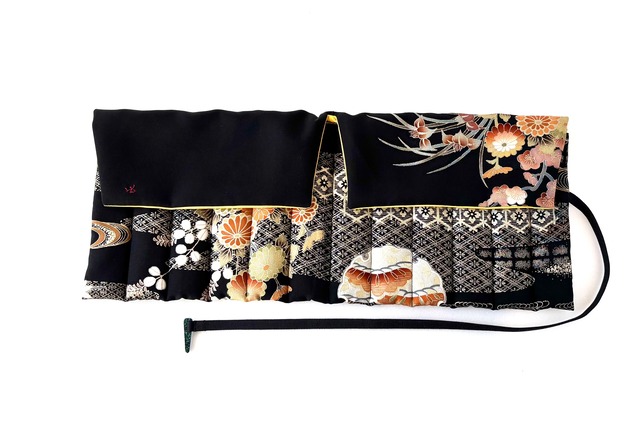 This pen pouch can even hold XL-sized pens. The yellow cloth inside is a microfiber cloth called Urushi Clean, which is made specifically for lacquer-coated surfaces.The inner cloth allows you to put the pen in the pen case after it has been wiped clean by the action of putting the pen in and taking it out. When this pouch is open, there is a pen bed space where you can temporarily place pen caps and pens themselves. You can place your pens using the pen holder, which is a fastener. The pen holder is made of wood, so you can place your pens gently without damaging them. The pen rest is finished using a technique called "tamari-nuri," in which brown transparent urushi is applied over Fuki-urushi. Both ends are finished using a technique called "raden," in which shells are glued together with green urushi, and green urushi is applied to the gaps between the shells, and then the pieces are polished. Both are made using precious natural urushi produced in Japan. The string is called Sanada Himo. The warp and weft threads intersect at right angles, and the weft threads are strongly driven and compressed during weaving, resulting in a durable string with almost no elasticity. This is a traditional string that has been around since the Edo period in Japan. The obi fabric for this kimono features a gorgeous design of gold chrysanthemums and pine trees on a black background. The contrast between the black and gold creates a fabric reminiscent of Maki-e. Each piece is unique, and no two are alike. [Size] for 2 pens (XL-size) ・(when unfolded) Width 9.5cm×Length 19cm ・(when folded) Width 22.5cm×Length 18.5cm(+cover part 8cm) →Pen size that can be stored: Namiki #50, Pelikan M1000 and Montblanc 146 / 149 [Weight of body] 43g [Materials used] ・Outer fabric : vintage kimono obi-fabric pure silk (ultra-fine micro fiber fabric from Teijin / A cloth specially made to be suitable for lacquered objects) ・String:Sanada-string Cotton ・Kohaze(fasteners):Hinoki-wood Kiji-tamenuri finish+Raden (abalone)