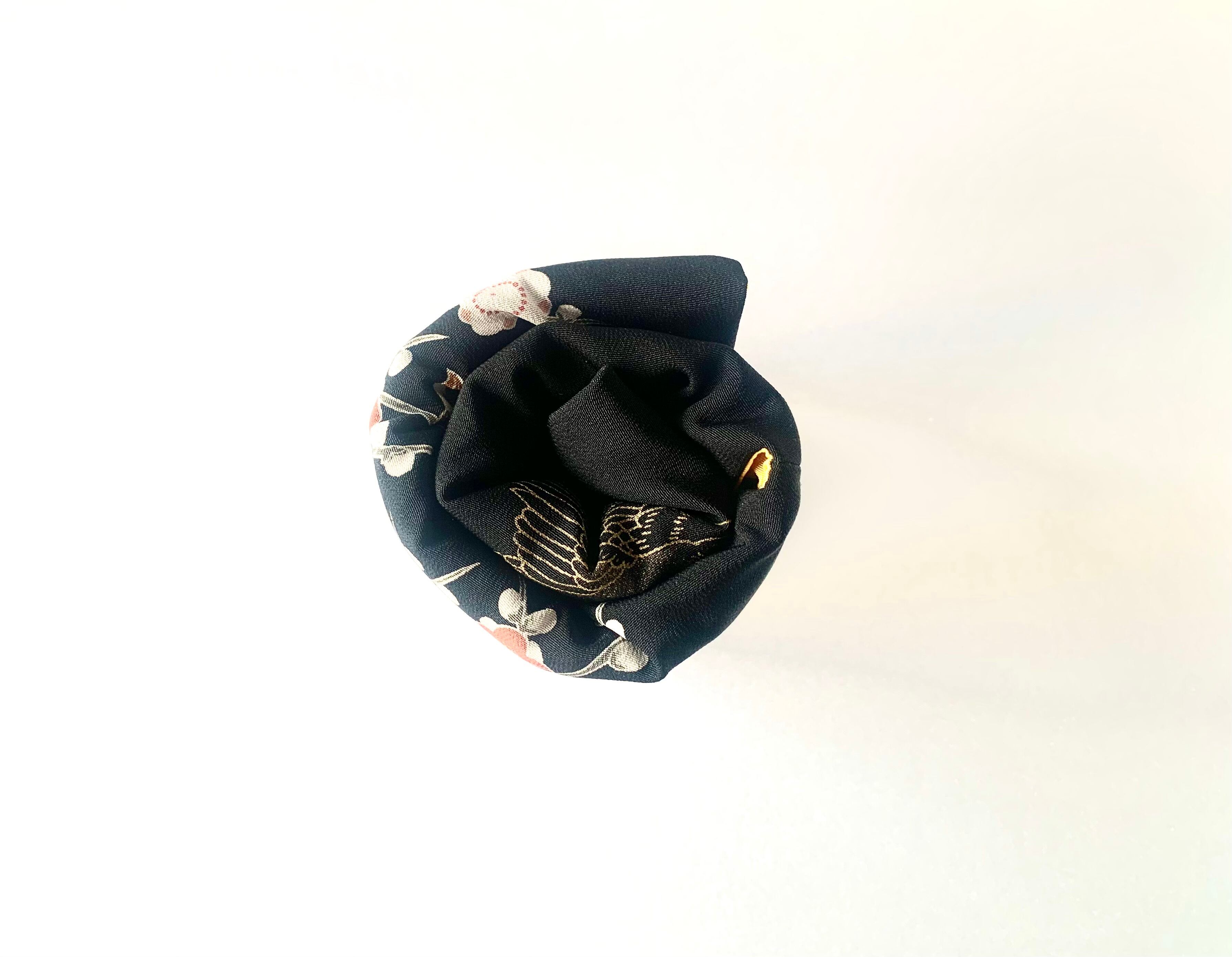 The kimono fabric used this time features elegant designs of plum blossoms, birds dancing, chrysanthemum flowers, and flowing water. The subdued colored parts were cut out and used on the front side, and the vibrant patterned parts were placed on the inside.