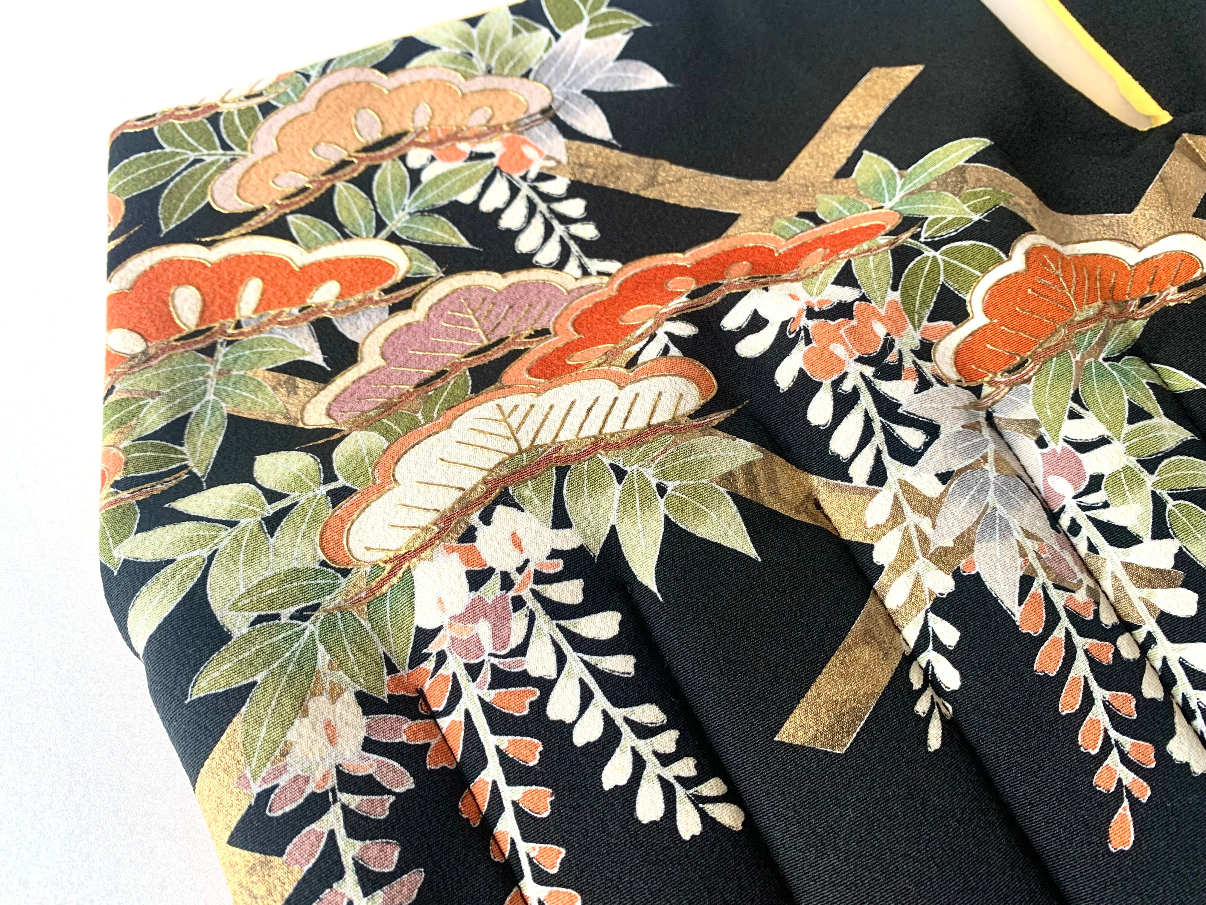 The fabric for this kimono is black-tomesode.The black Tomesode is the most formal dress (first dress) for married women. It is mainly worn on celebratory occasions such as weddings and wedding receptions. Therefore, it is painted with auspicious patterns.