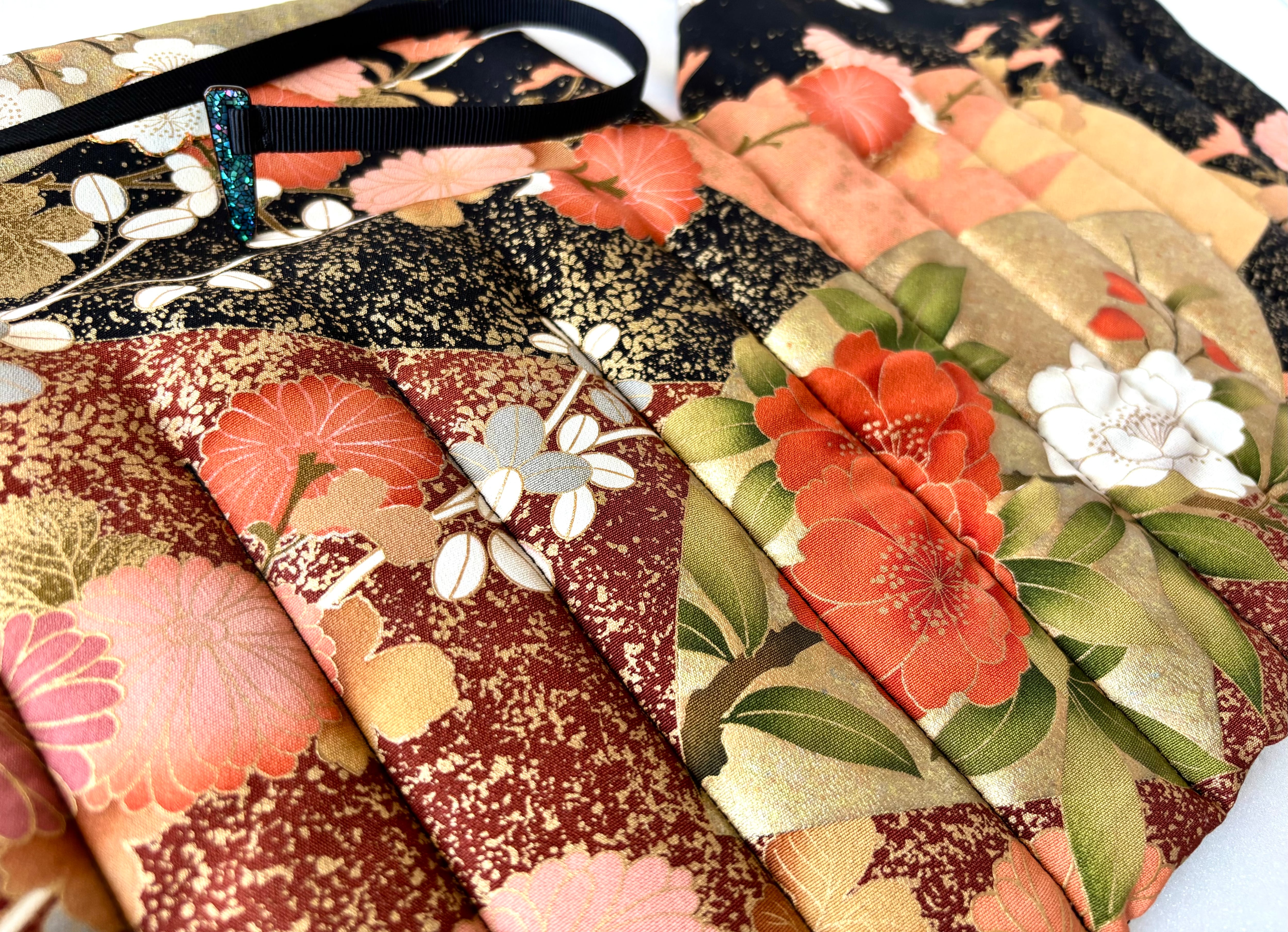 The pattern of this kimono features gorgeously drawn chrysanthemums, bush clover leaves, camellias, plum blossoms, and other flowers on a background of fan shapes (Ougi) and scattered gold leaf. These are traditional Japanese flowers that bloom from autumn through winter and spring. The fabric for this kimono features a beautiful contrast between red and orange hues and gold and black.
