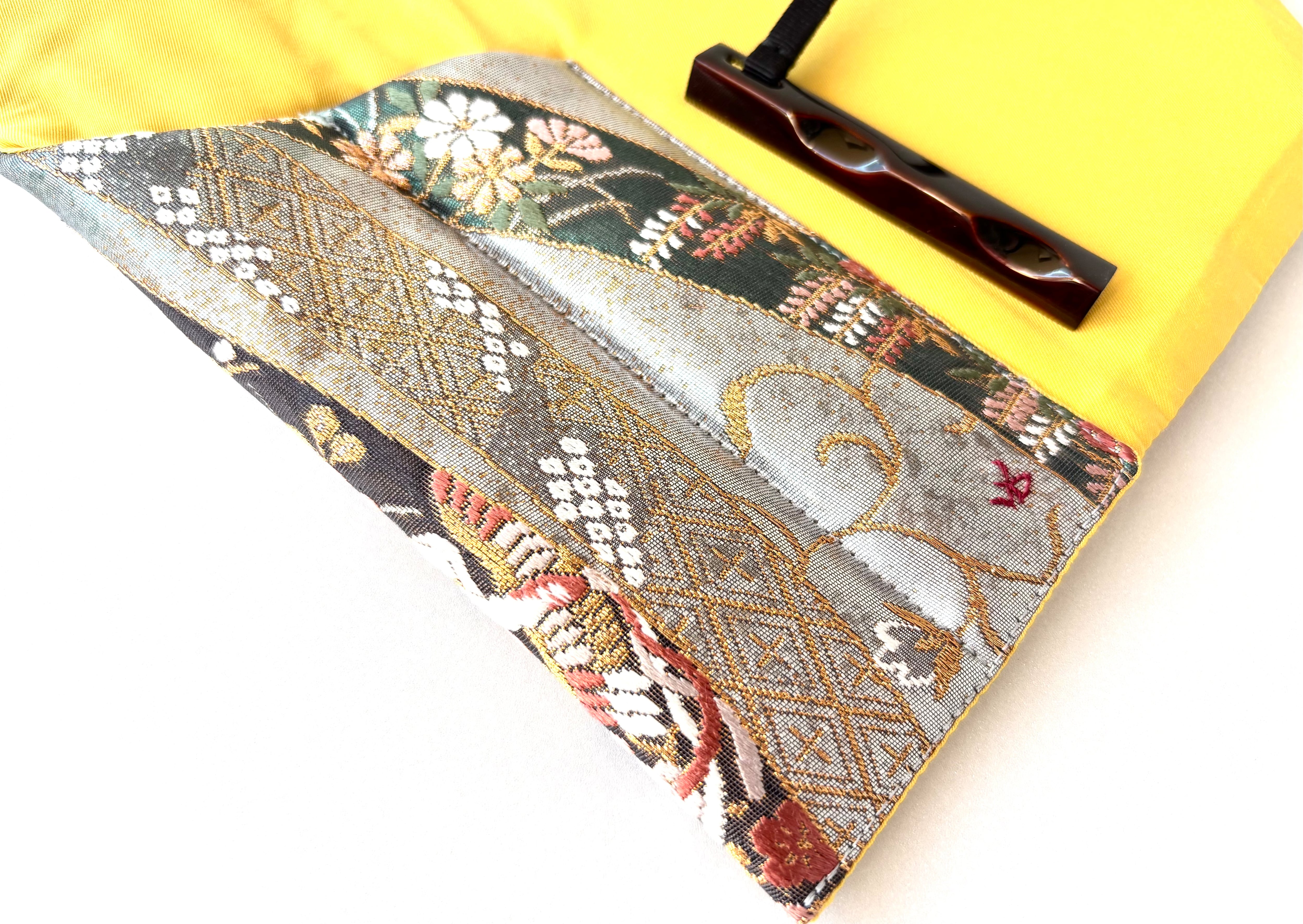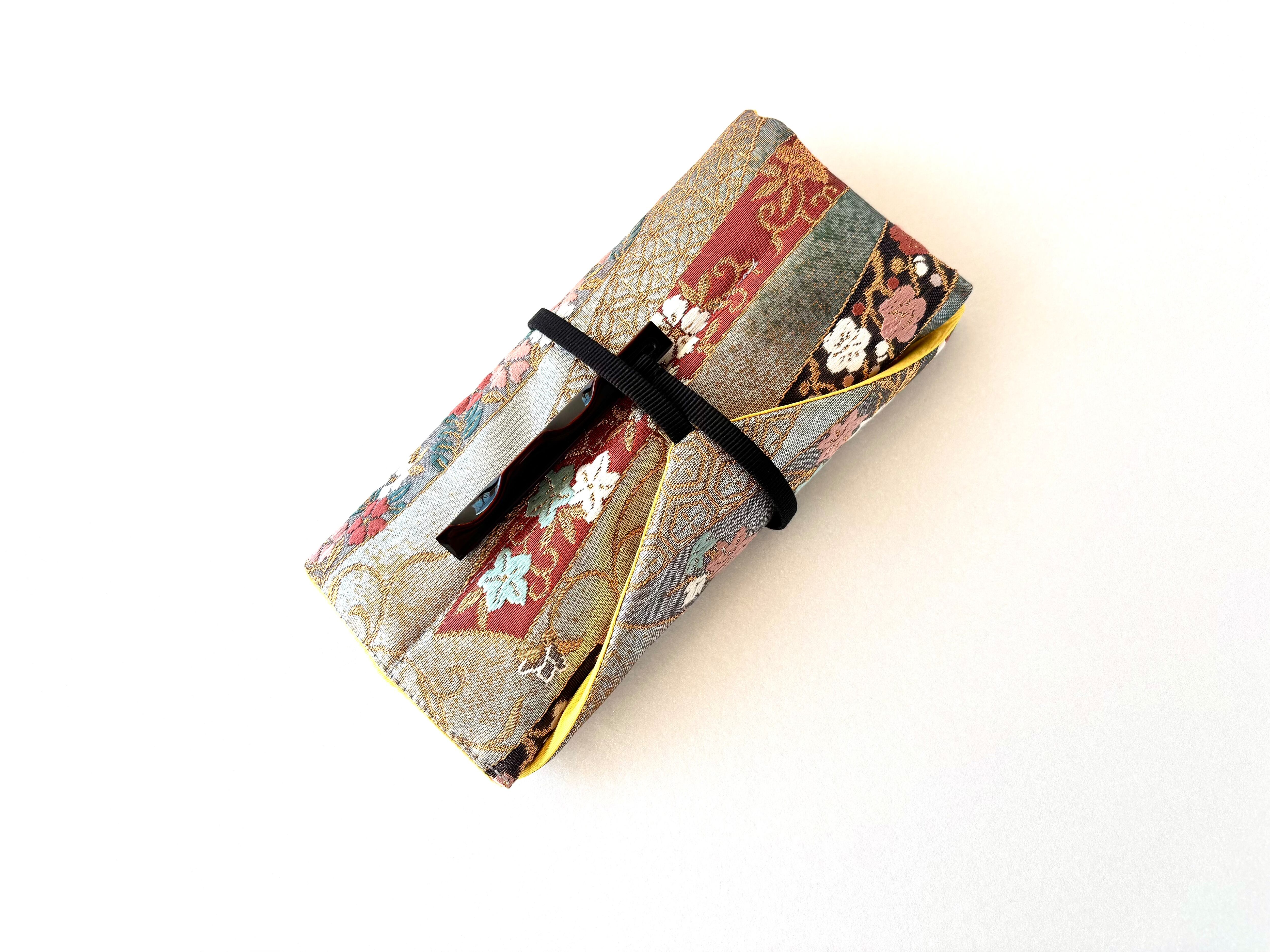 The pattern on the kimono-obi of this pen pouch is an elegant design reminiscent of the long, slender decorative obi called a "Kazura-obi," which is worn by female actors in the traditional Japanese performing art of Noh, wrapped around their heads like a headband, tied at the back, and hanging down their backs, fluttering in the wind. It is embroidered with flowers of each season.