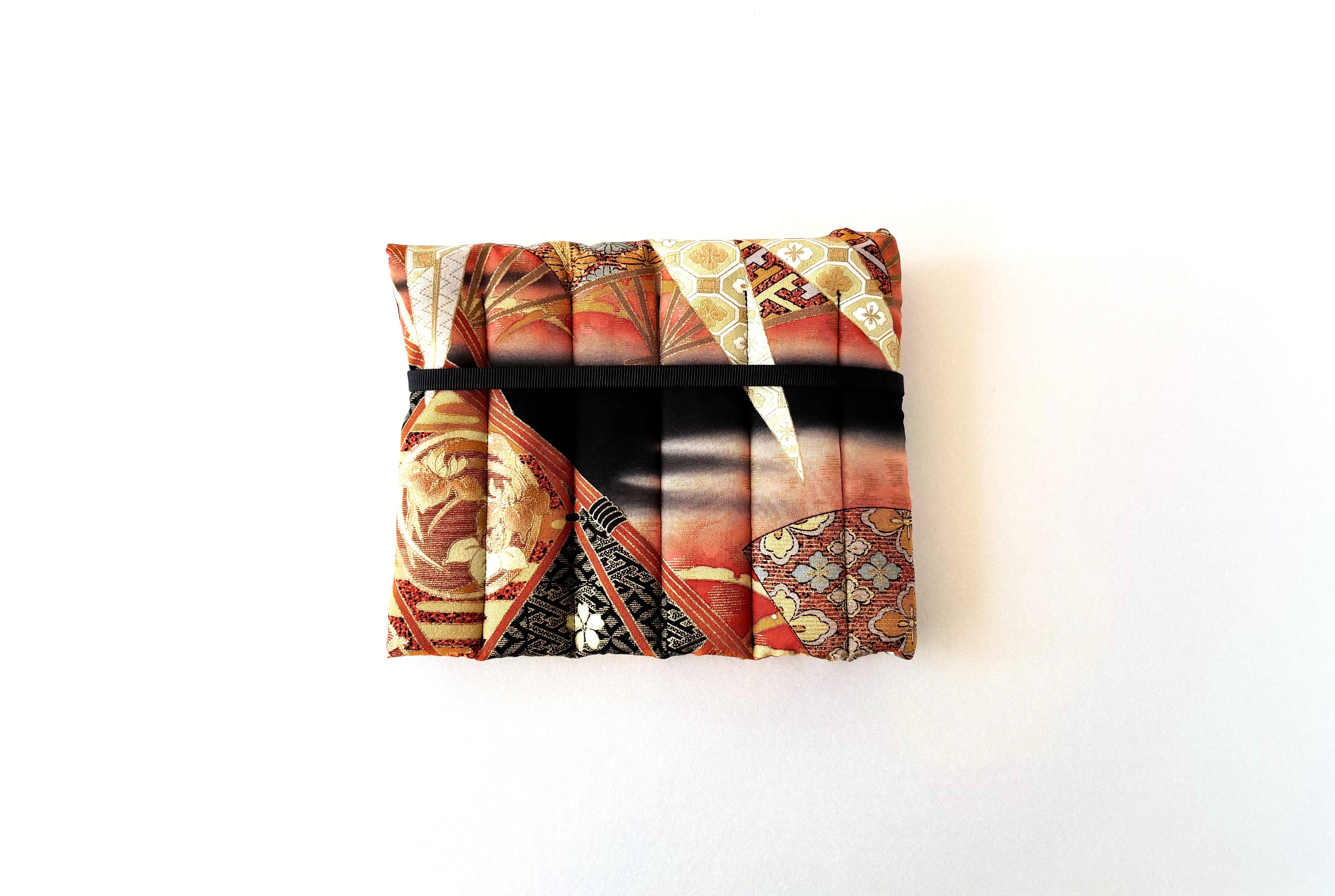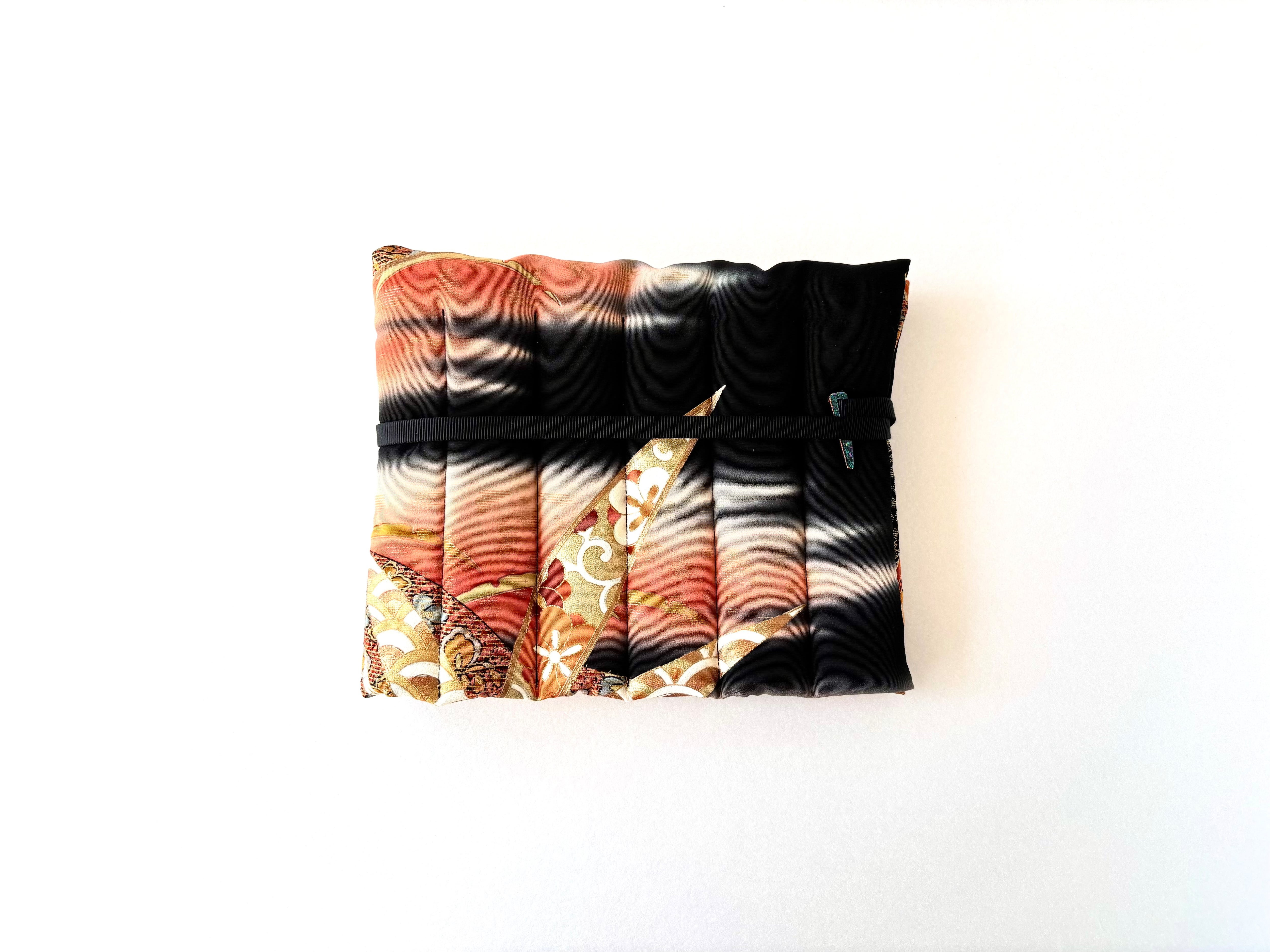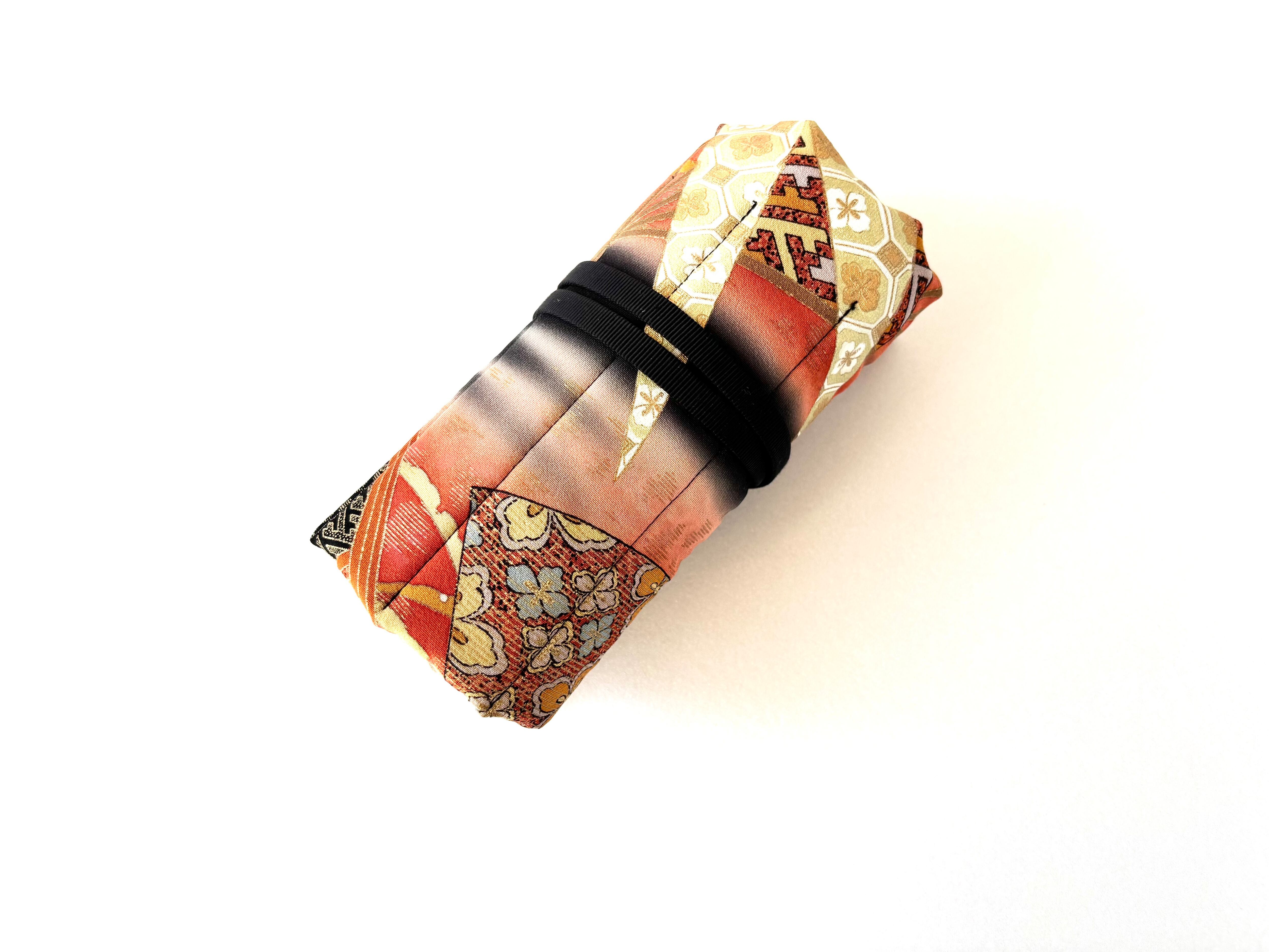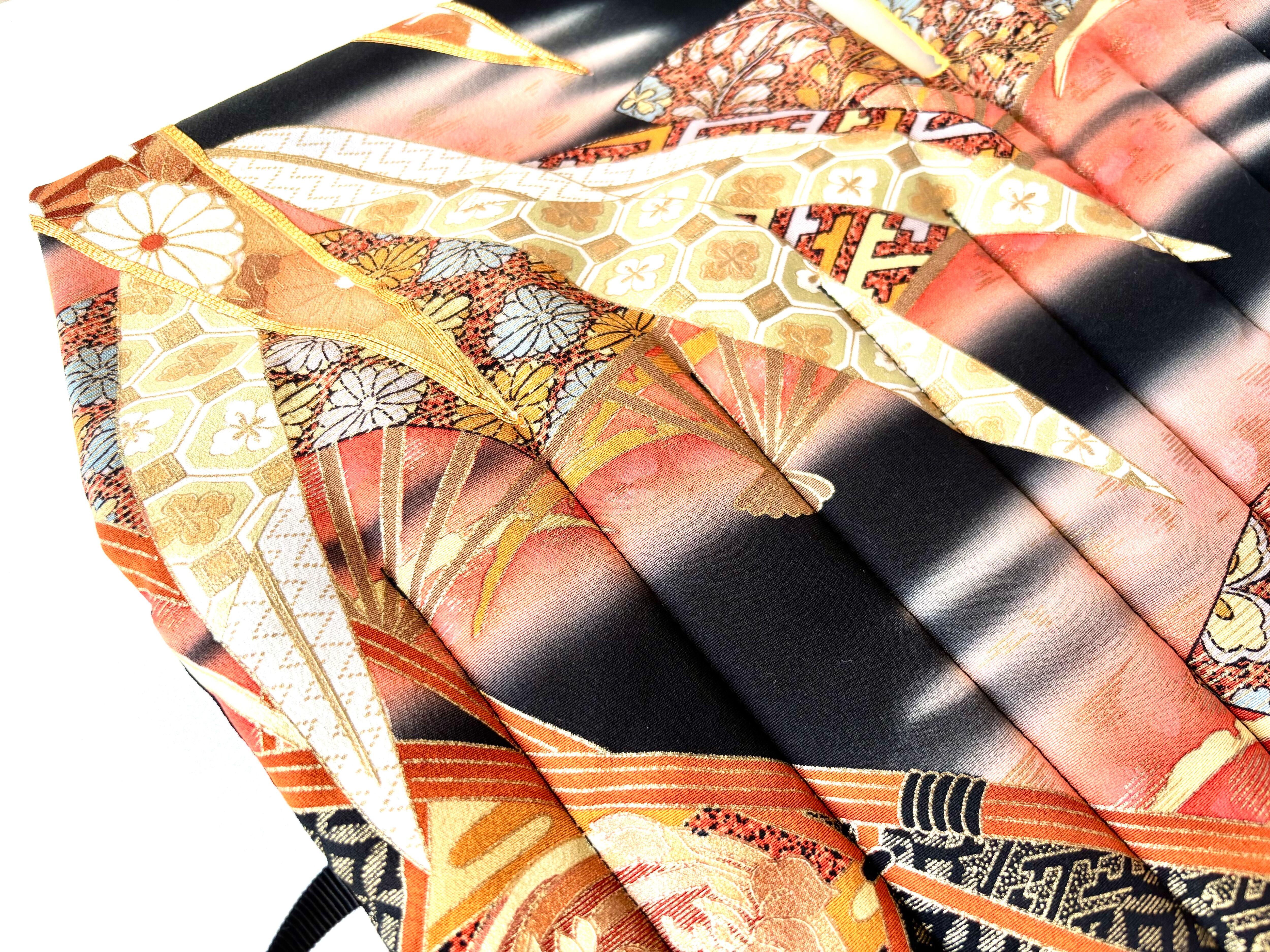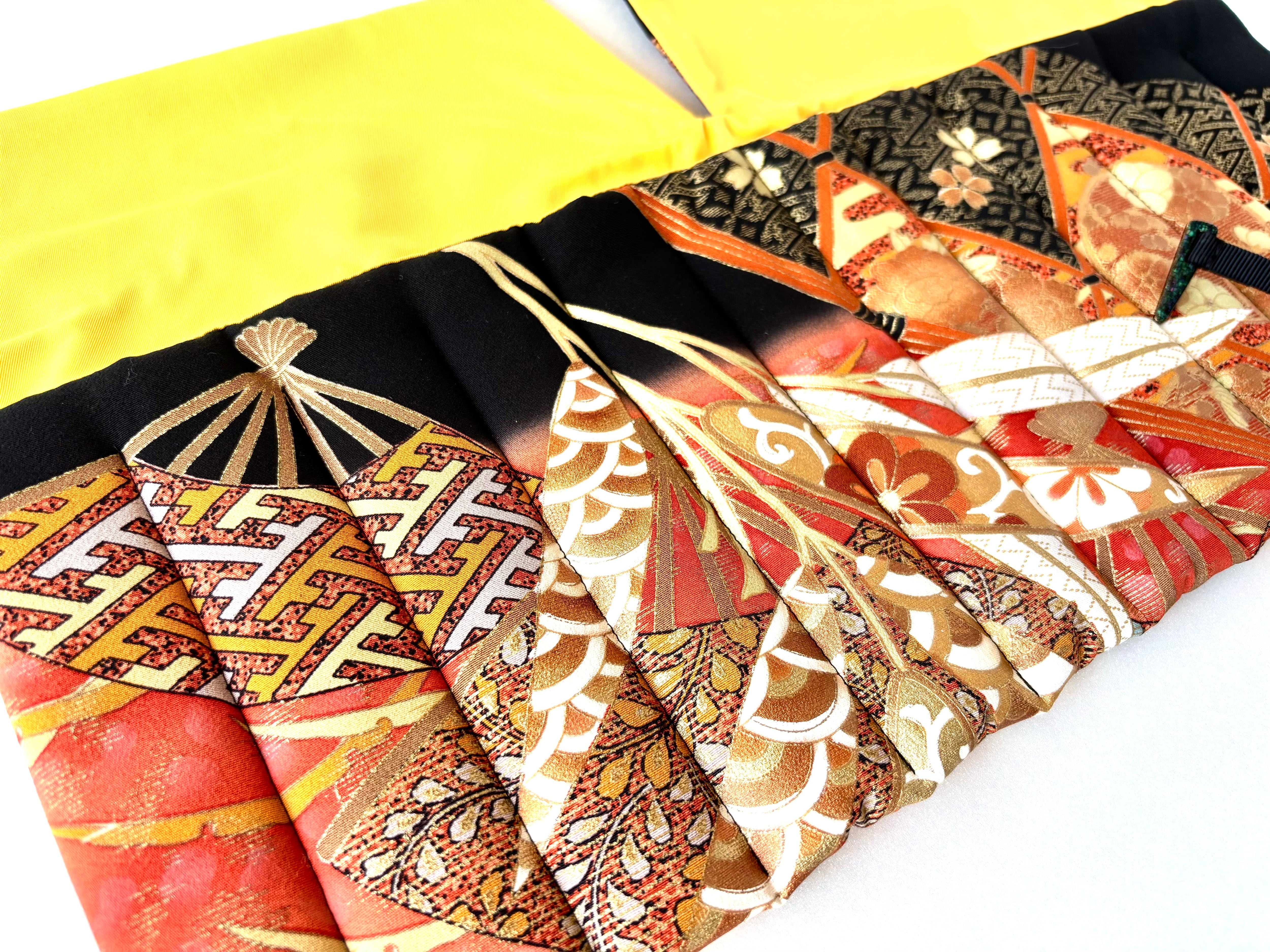 The kimono fabric used this time is a very gorgeous fabric with a black background and a gradient orange dye, featuring fans and bamboo, with floral patterns such as chrysanthemums and cherry blossoms on the fans and bamboo. The bamboo motif on the kimono is an auspicious motif that represents "growth" and "vitality" because of its straight growth, "longevity and immortality" because it remains green even in winter, "moderation" because it has nodes, and "nobility and honesty" because it is hollow inside.