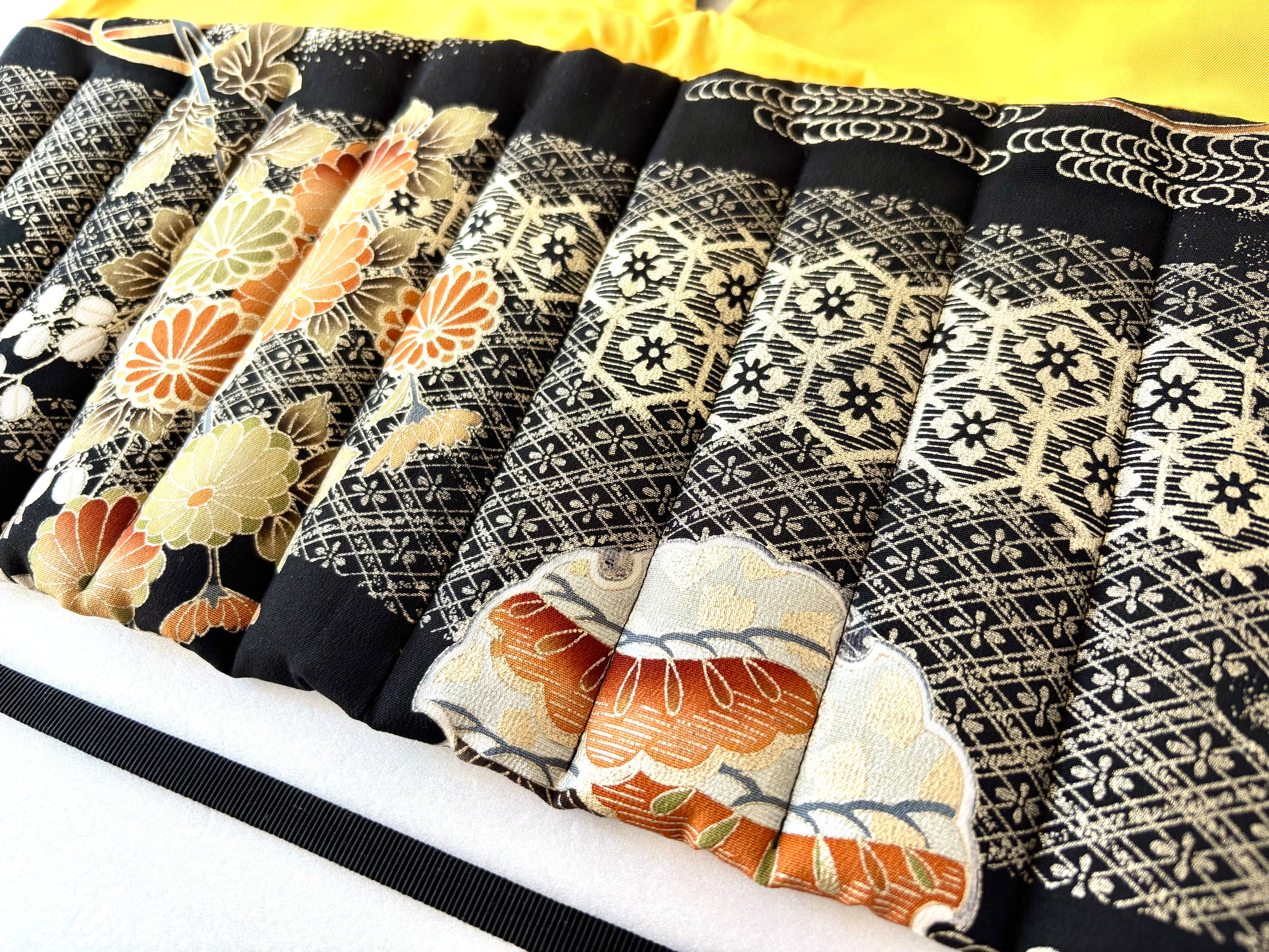 The kimono fabric used this time is black with flowers of the four seasons painted in delicate lines and pale tones. The background of the design features a traditional Japanese diamond lattice pattern. The diamond pattern used in tomesode is a classic auspicious motif with a long history that was also seen in the costumes of aristocrats in the Heian period.